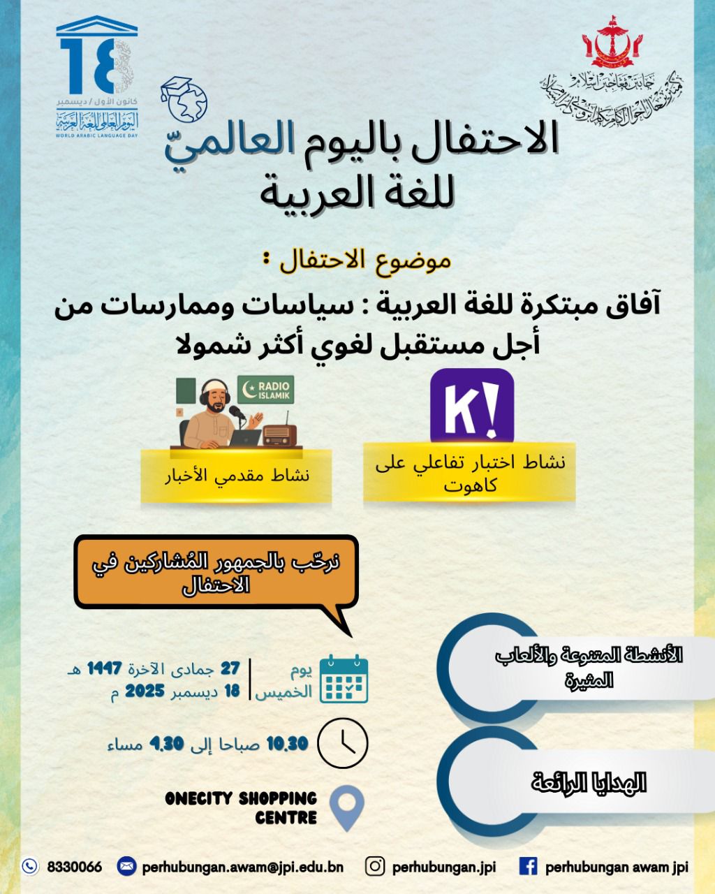 Unit Ta’zeez Al-Luhgah Al-‘Arabiah, Bahagian Sekolah Arab, Jabatan Pengajian Islam, Kementerian Hal Ehwal Ugama akan menganjurkan aktiviti berbahasa Arab sempena Sambutan Hari Bahasa Arab Sedunia 1447H/2025M yang akan diadakan pada hari Khamis, 27 Jamadilakhir 1447H bersamaan 18 Disember 2025M mulai 10.30 pagi hingga 4.30 petang bertempat di Pusat Beli Belah One City, Kampung Sungai Hanching.