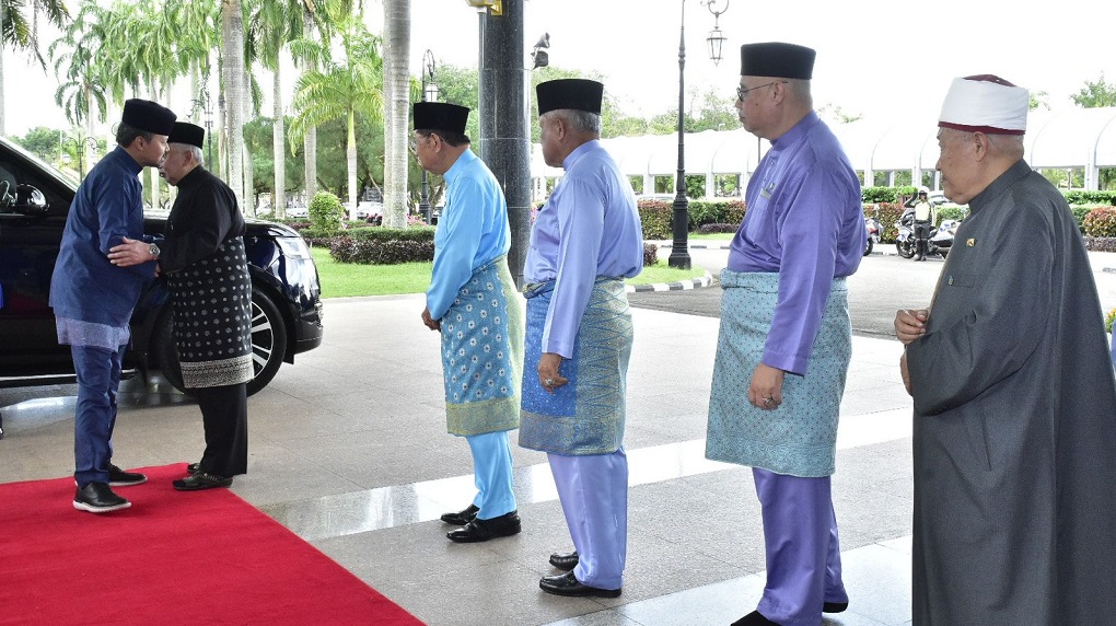 Keberangkatan tiba Duli Yang Teramat Mulia Paduka Seri Pengiran Muda Mahkota Pengiran Muda Haji Al-Muhtadee Billah ibni Kebawah Duli Yang Maha Mulia Paduka Seri Baginda Sultan Haji Hassanal Bolkiah Mu'izzaddin Waddaulah, Menteri Kanan di Jabatan Perdana Menteri serta Kerabat Diraja dijunjung oleh Yang Amat Mulia Pengiran Indera Setia Diraja Sahibul Karib Pengiran Anak Haji Idris bin Pengiran Maharaja Lela Pengiran Muda Abdul Kahar, Yang Di-Pertua Adat Istiadat Negara; Yang Berhormat Pehin Udana Khatib Dato Paduka Seri Setia Ustaz Awang Haji Badaruddin bin Pengarah Dato Paduka Awang Haji Othman, Menteri Hal Ehwal Ugama; Yang Berhormat Pehin Datu Lailaraja Mejar Jeneral (Bersara) Dato Paduka Seri Awang Haji Halbi bin Haji Mohd Yussof, Menteri di Jabatan Perdana Menteri dan Menteri Pertahanan II; Yang Berhormat Dato Seri Setia Awang Haji Nazmi Mohamad, Menteri Kebudayaan, Belia dan Sukan selaku Pengerusi Ahli Jawatankuasa Tertinggi Sambutan Ulang Tahun Hari Kebangsaan Negara Brunei Darussalam Ke-42, Tahun 2026; Yang Berhormat Pehin Datu Seri Maharaja Dato Paduka Seri Setia Dr. Ustaz Haji Awang Abdul Aziz bin Juned, Mufti Kerajaan; Yang Mulia Dato Seri Paduka Awang Mohammed Riza bin Dato Paduka Haji Mohammed Yunos, Timbalan Menteri (Urustadbir Perkhidmatan Awam) di Jabatan Perdana Menteri; dan Yang Mulia Pengiran Dato Seri Paduka Haji Mohammad Tashim bin Pengiran Haji Hassan, Timbalan Menteri Hal Ehwal Ugama.