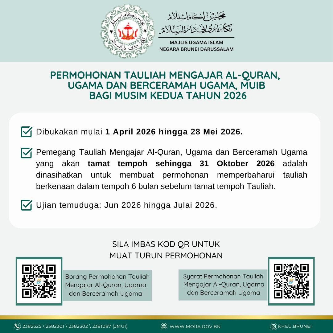 Permohonan Tauliah Mengajar Al-Quran, Ugama dan Berceramah Ugama bagi Musim Kedua Tahun 2026 adalah dibukakan mulai 1 April 2026 hingga 28 Mei 2026.
