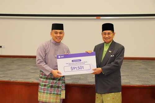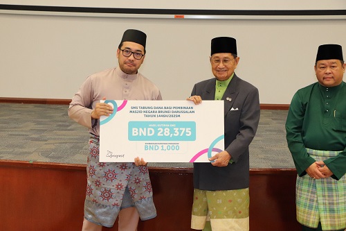 Yang Mulia Radin Sufri Radin Basiuni, Ketua Pegawai Eksekutif DST Sendirian Berhad menyerahkan sumbangan hasil kutipan perkhidmatan SMS sebanyak BND$91,501.00. Diselajurkan dengan penyampaian sumbangan dari Datastream Digital Sendirian Berhad (DST) sebanyak BND$10,000.00 untuk Tabung Dana bagi Pembinaan Masjid Negara Brunei Darussalam.